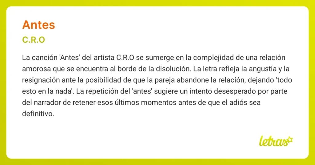 - ¿Cuál es el mensaje principal en la versión de C.R.O? La versión de C.R.O transmite un mensaje de resignación y aceptación de una ruptura amorosa inminente. La repetición de " Antes " enfatiza el apego a los últimos momentos de la relación.