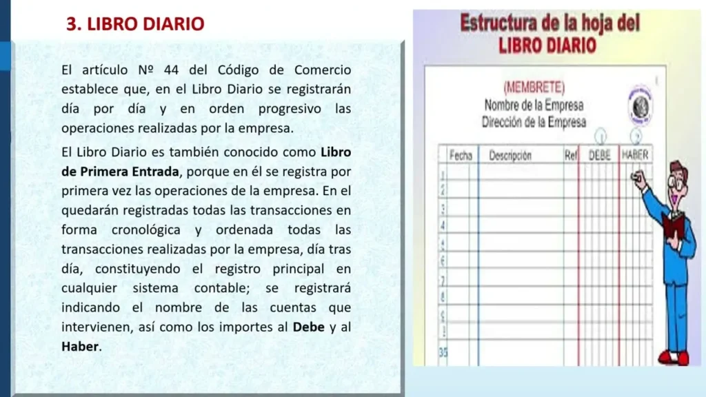 - Forma y contenido: Debe llevarse de forma ordenada y sistemática, con una numeración correlativa de las páginas. Cada asiento debe incluir la fecha, la descripción de la operación, los nombres de las partes intervinientes, los importes y las cuentas afectadas.