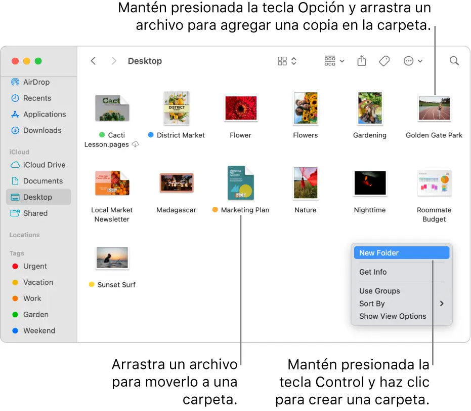 | Carpeta de Archivos | Crear carpeta en Finder | Escritorio, Documentos, etc. | Organización de archivos |