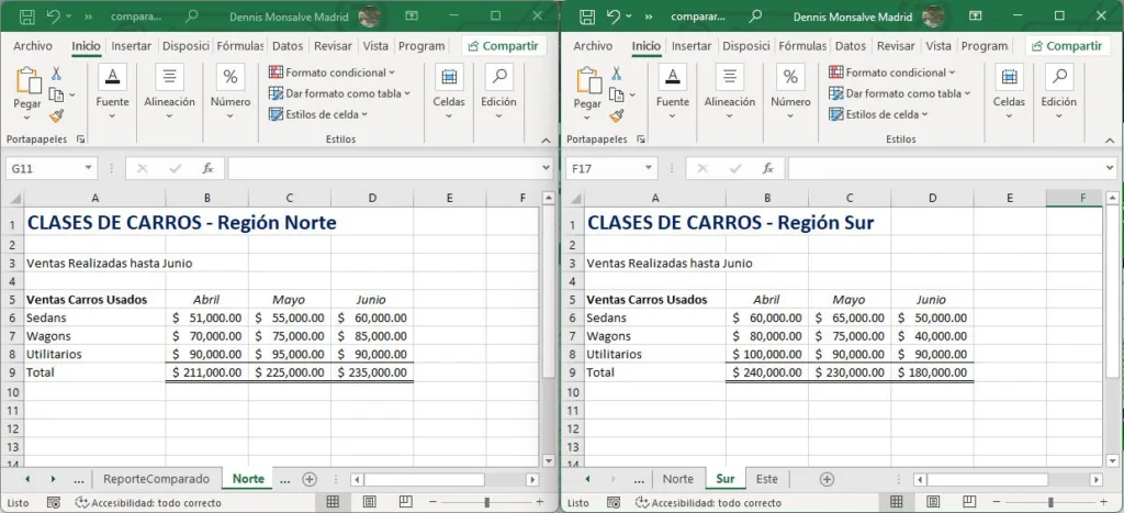 - Selecciona las dos hojas (o libros) que deseas comparar.