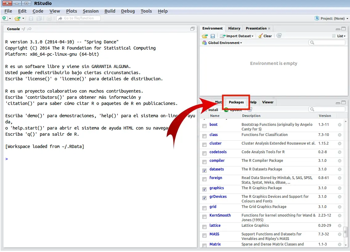 - Acceder a la pestaña "Packages": En la ventana inferior derecha, deberías encontrar una pestaña llamada "Packages" o "Paquetes".