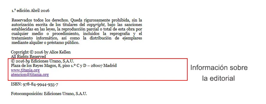 - Nombre de la editorial (puede aparecer de forma más detallada que en la página de título)