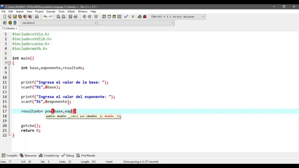 #include <math.h>Sin embargo, incluir el encabezado no es suficiente. También debes vincular la librería durante la compilación. Esto se hace utilizando la opción -lm con el compilador gcc :
