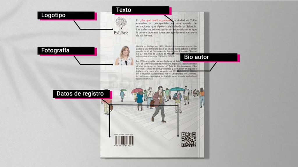 No olvides incluir el ISBN, el logotipo de la editorial y, opcionalmente, un código QR que enlace a más información online. Estos datos editoriales en la contraportada son información esencial.