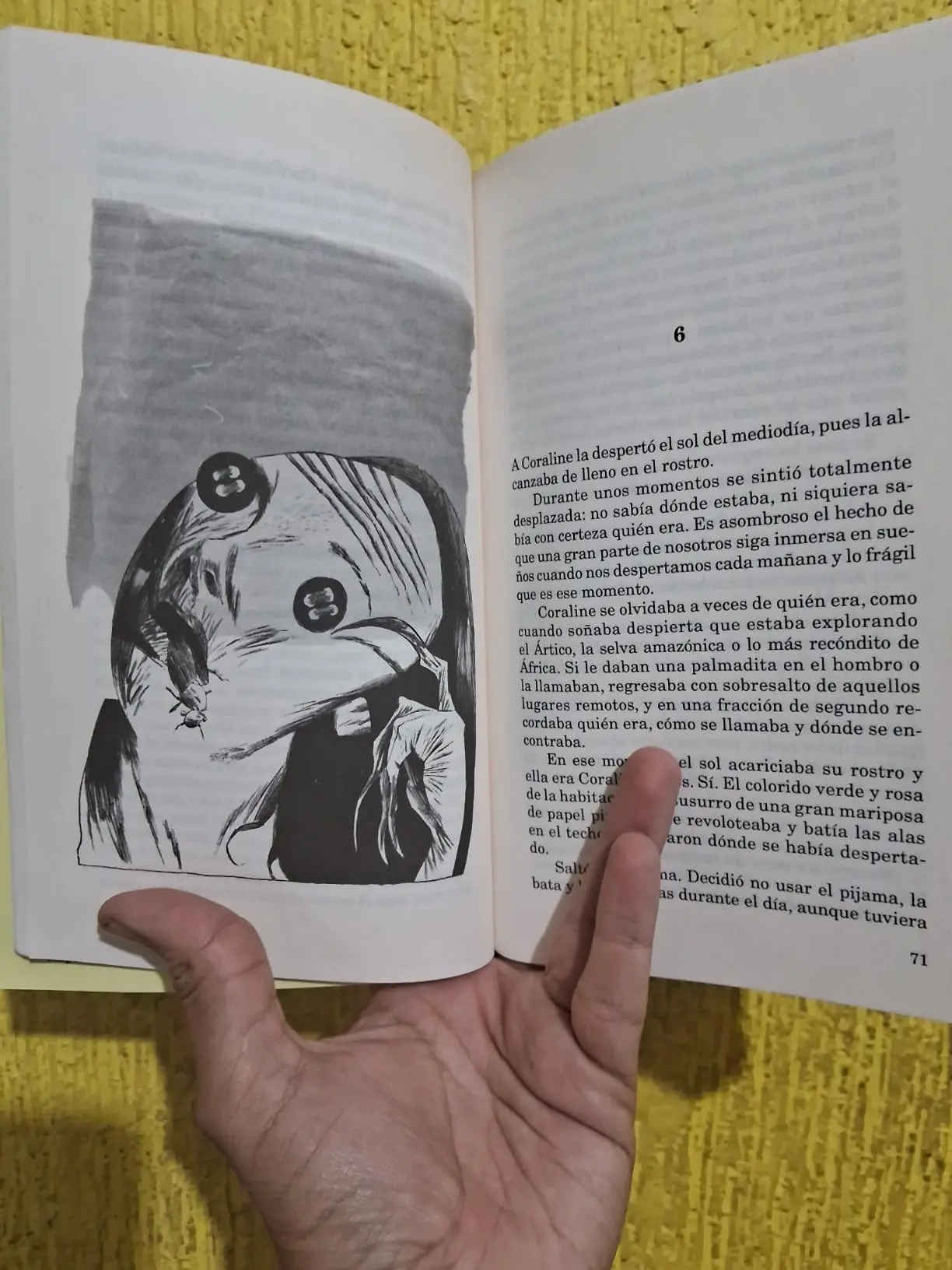 El terror en Coraline no es explícito, sino más bien insinuante. Se basa en la inquietante sensación de algo oscuro que acecha en las sombras, personificado en la «otra madre», con sus inquietantes botones por ojos. Este elemento de suspense crea una tensión constante que mantiene al lector en vilo.