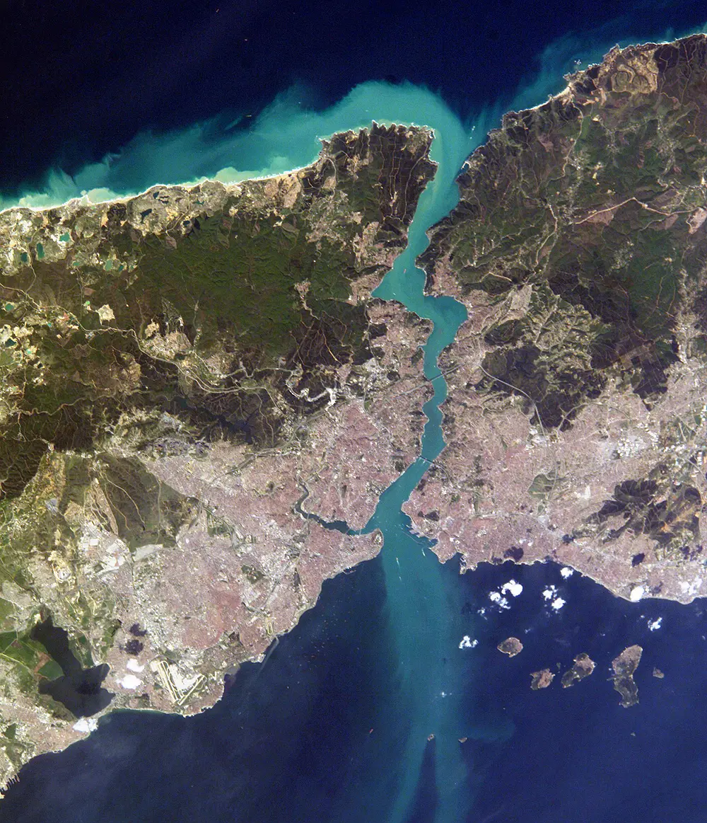 Situado en la orilla europea del Bósforo, el Cuerno de Oro es un estuario en forma de cimitarra de aproximadamente 5 kilómetros de largo y 750 metros de ancho en su parte más ancha. Su profundidad máxima alcanza los 35 metros en su desembocadura en el Bósforo, lo que lo convierte en un puerto natural excepcional. Este estratégico emplazamiento, que conecta el Mar de Mármara con el Mar Negro, ha proporcionado refugio y protección a innumerables barcos a lo largo de la historia.