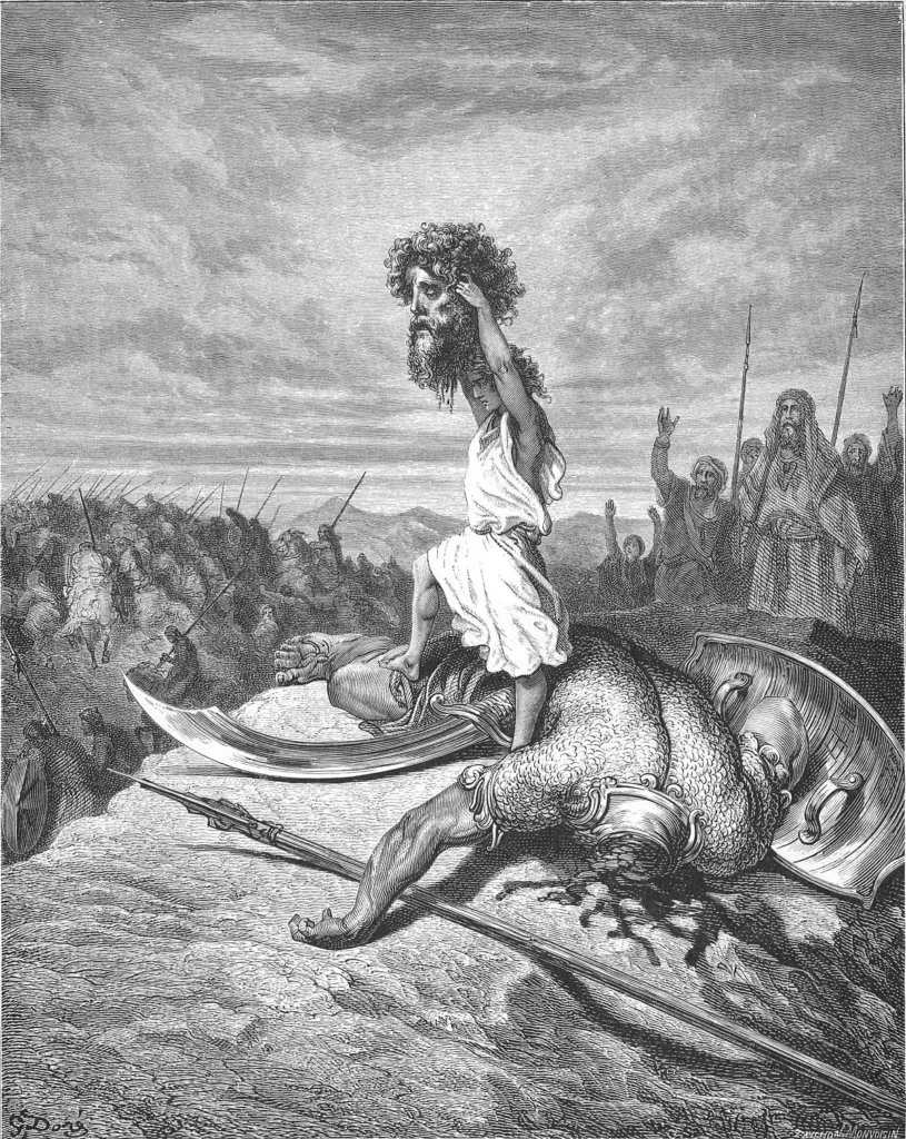 La historia enfatiza el contraste entre la apariencia física imponente de Goliat y la humildad y fe inquebrantable de David. David, armado únicamente con una honda y cinco piedras, confió en el poder de Dios para vencer a su adversario. Tras una oración, David lanzó una piedra que impactó en la frente de Goliat, derribándolo. David entonces, aprovechando la oportunidad, remató al gigante con su propia espada.