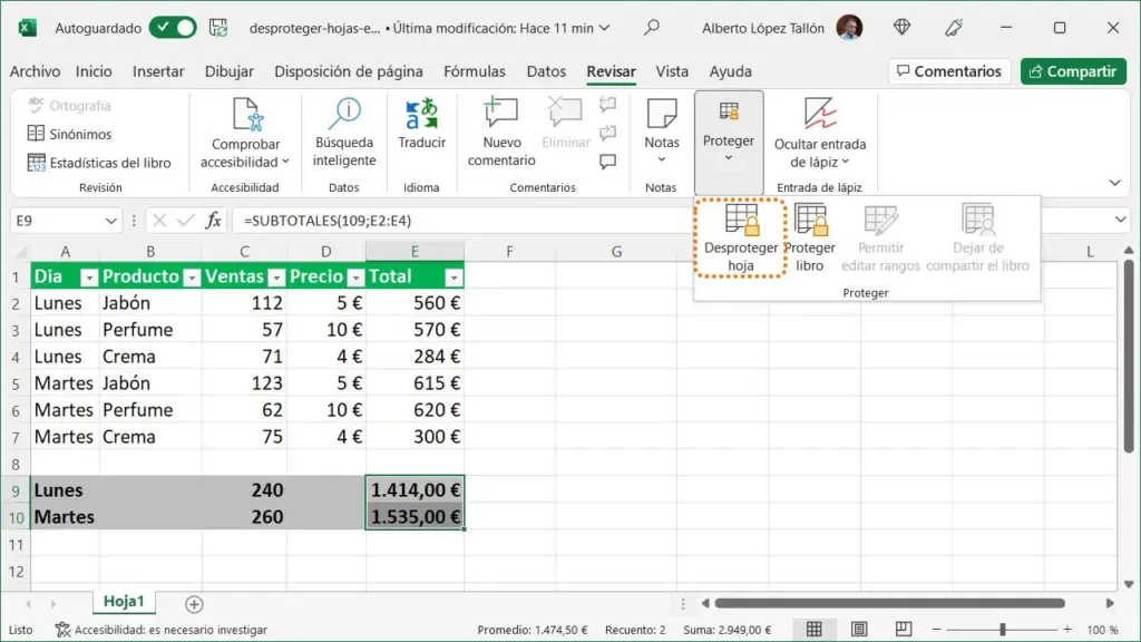 4. Para desproteger la hoja , simplemente haz clic en "Desproteger hoja". Esto eliminará automáticamente la contraseña de la hoja.