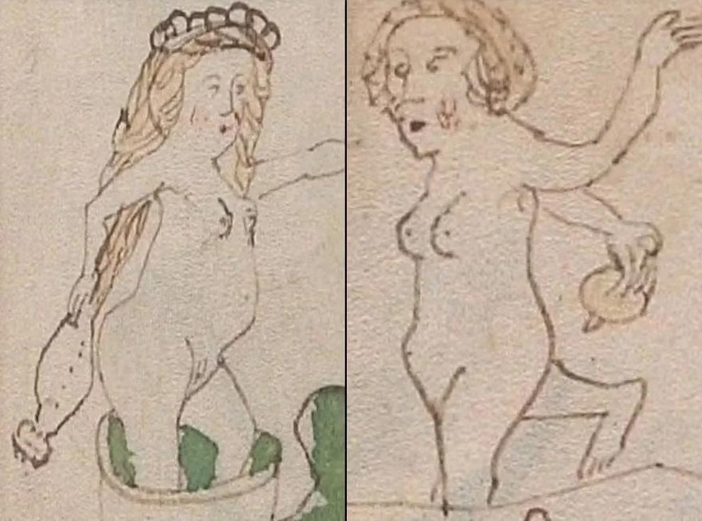 Los dibujos de mujeres desnudas conectadas a tubos y con otros elementos apuntando a sus genitales han sido interpretados de diversas maneras. Algunos expertos han sugerido que podrían representar conceptos médicos relacionados con la anatomía femenina de la época. La interpretación de estas imágenes y su contexto son cruciales para la comprensión del manuscrito.