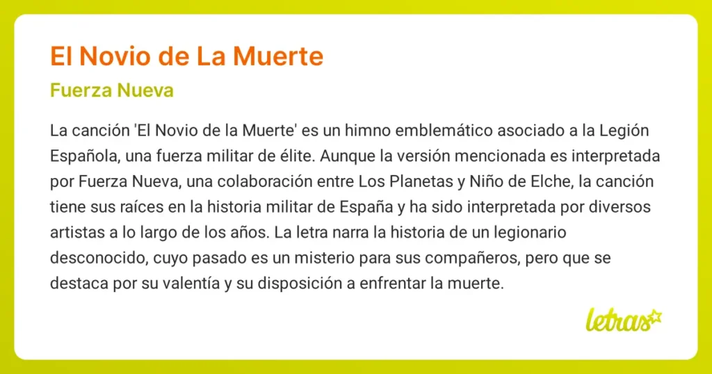 La letra de ' El Novio de la Muerte ' evoca la figura de un legionario anónimo, un hombre envuelto en un aura de misterio. Su pasado permanece oculto a sus compañeros, pero su coraje y su aceptación de la muerte como una novia lo convierten en un personaje inolvidable. La canción pinta un cuadro vívido de un hombre marcado por el dolor, que encuentra en la Legión un propósito, una forma de trascender su sufrimiento. Su valentía en la batalla, su disposición a dar la vida por su causa, se convierten en un acto de heroísmo.