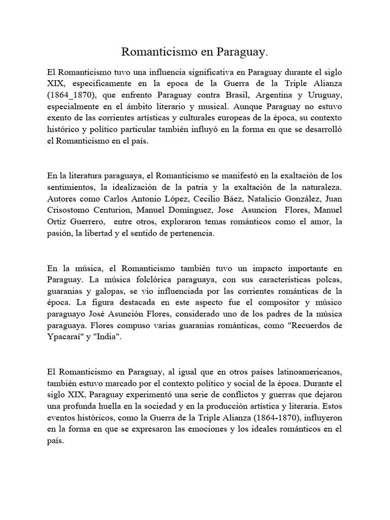 El Romanticismo en Paraguay, un movimiento que trascendió las fronteras europeas para echar raíces en el suelo americano, dejó una huella imborrable en la literatura y la música paraguaya del siglo XIX. Este ensayo profundiza en las características de este periodo crucial, investigando sus manifestaciones locales y la influencia de autores clave. A través de un análisis detallado, se busca comprender cómo este movimiento cultural se adaptó al contexto histórico y social paraguayo, ofreciendo una mirada integral a la rica expresión artística del país.