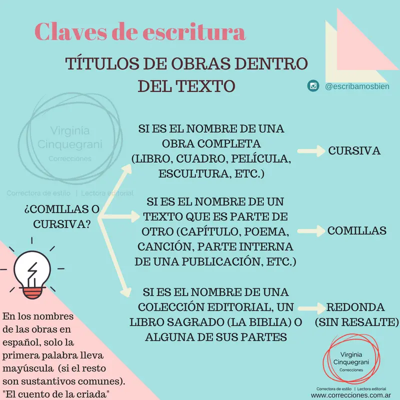 | Títulos de Libros | Comillas angulares (« ») o, en algunos casos, subrayado | Cursiva (preferible) o comillas, manteniendo coherencia |