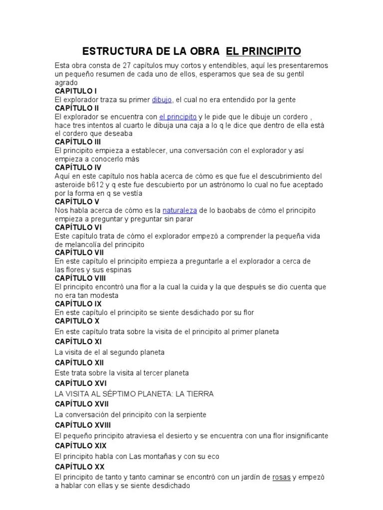 - ¿Cuál es el mensaje principal? El mensaje principal se construye a lo largo de toda la estructura interna, mediante la sucesión de encuentros y reflexiones del Principito, culminando en la comprensión del amor, la amistad y el valor de la vida sencilla.
