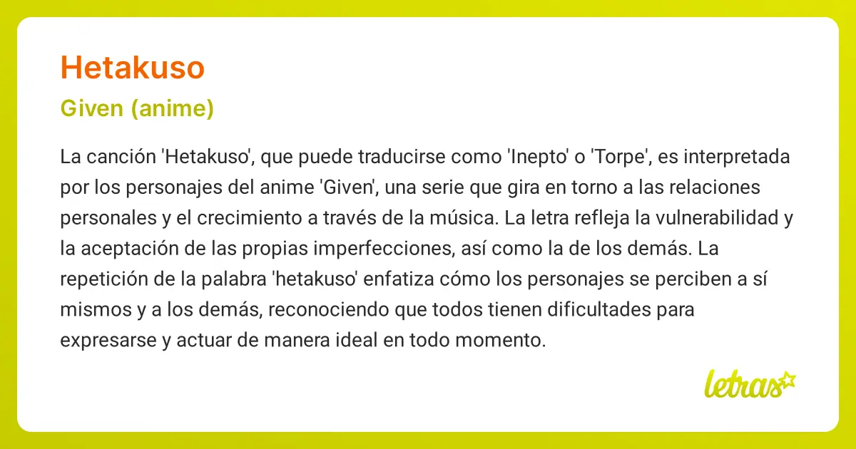 Más allá de la historia de amor entre Ritsuka y Mafuyu, Given explora temas universales como la pérdida, el duelo, la aceptación de la propia vulnerabilidad, y el poder sanador del arte y las relaciones humanas. La música sirve como vehículo para la expresión de emociones profundas, tanto para los personajes como para el espectador. La canción "Hetakuso" (Inepto o Torpe), por ejemplo, refleja la imperfección como un vínculo entre los personajes, enfatizando la autenticidad y la importancia de la comunicación genuina.