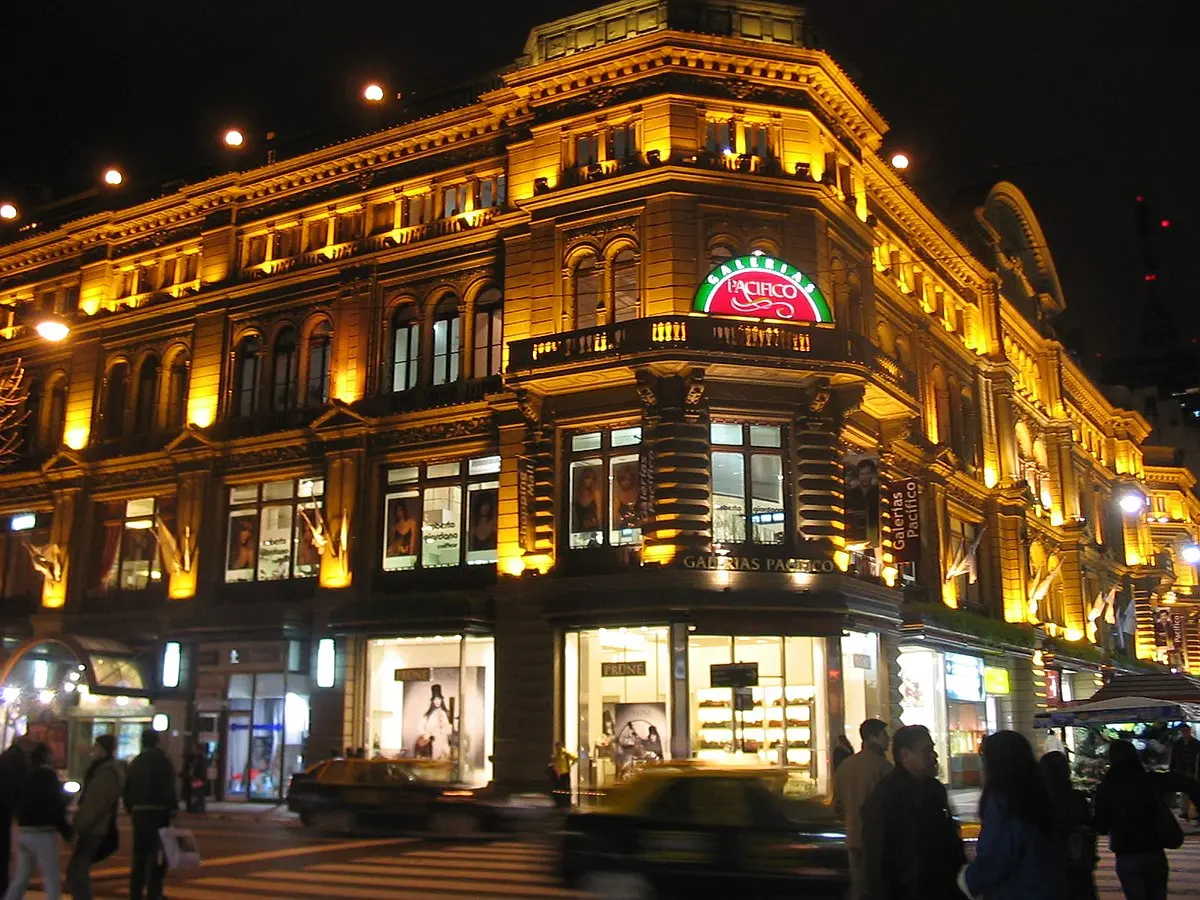 El imponente edificio de Galerías Pacífico, obra del ingeniero Emilio Agrelo y el arquitecto Roland Le Vacher, fue proyectado en 1888 con la inspiración de las grandes galerías europeas, como la Galería Víctor Manuel II de Milán. Su diseño, con bóvedas de vidrio y una cúpula central espaciosa, refleja un elegante lenguaje neorrenacentista. Sin embargo, el proyecto original de la tienda por departamentos nunca se concretó completamente, y el edificio albergó diversos comercios a lo largo de los años. En 1896, incluso albergó el Museo Nacional de Bellas Artes y la Academia Nacional de Bellas Artes. La incorporación de ascensores mecánicos, iluminación y calefacción centralizadas representaba un adelanto tecnológico para su época.