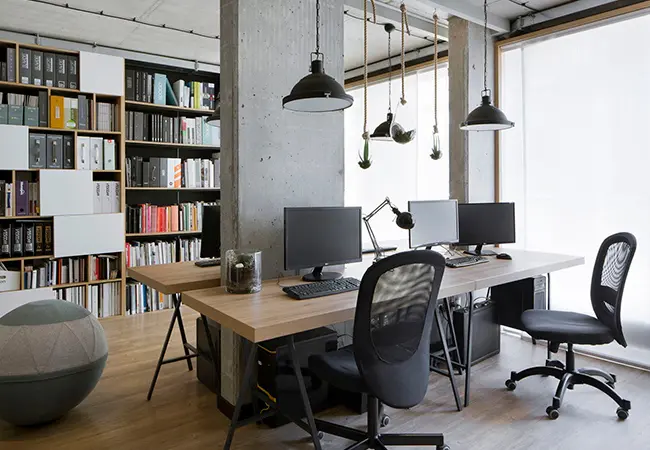 - Separación de Ambientes: Las librerías actúan como divisores de espacios, creando diferentes zonas funcionales dentro de una misma oficina. Son una alternativa estética y práctica a las paredes tradicionales, ideales para delimitar áreas de trabajo, zonas de reunión o espacios de descanso.