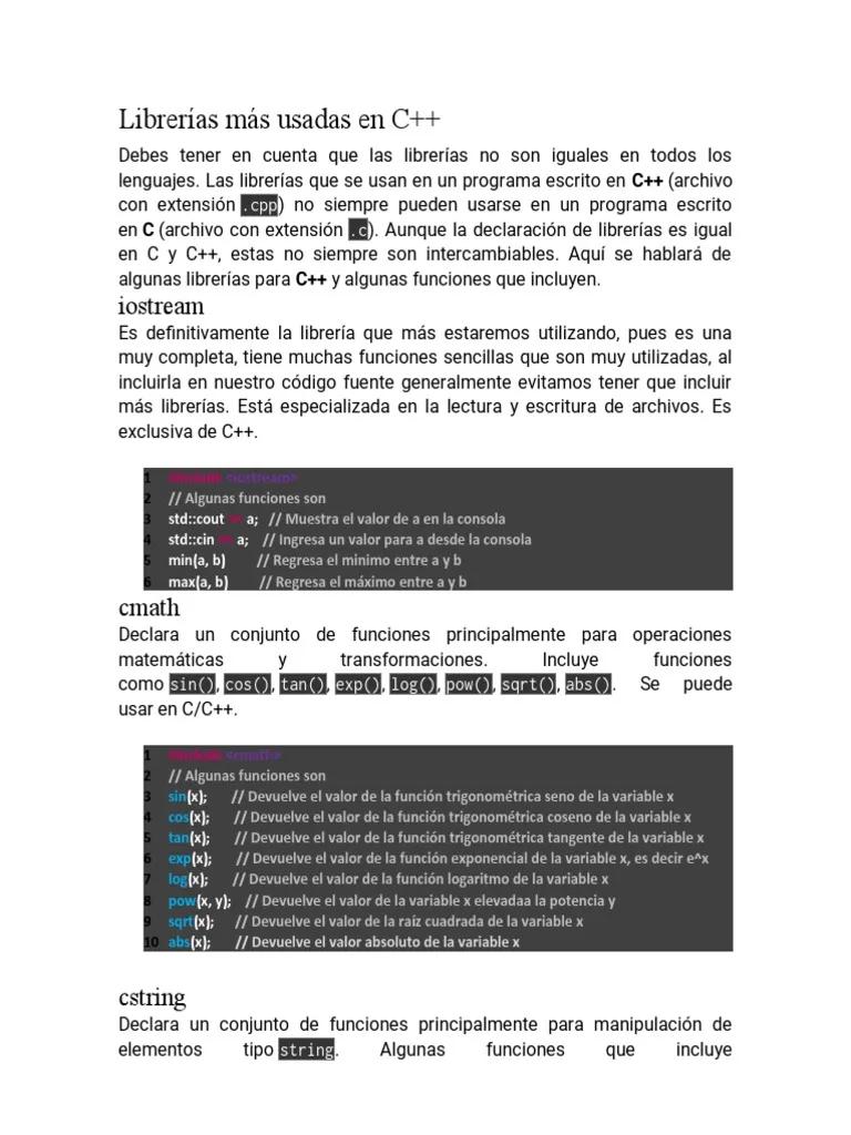 std::cin), escribir datos en la consola (std::cout) y trabajar con archivos. - cmath: Ofrece una amplia gama de funciones matemáticas, incluyendo funciones trigonométricas (