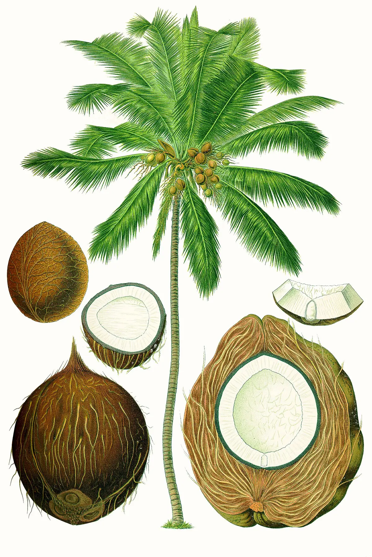 - Fruto (Coco): La pulpa se consume fresca o seca (copra), de la cual se extrae aceite para margarinas y jabones. El agua de coco es una bebida refrescante y nutritiva.