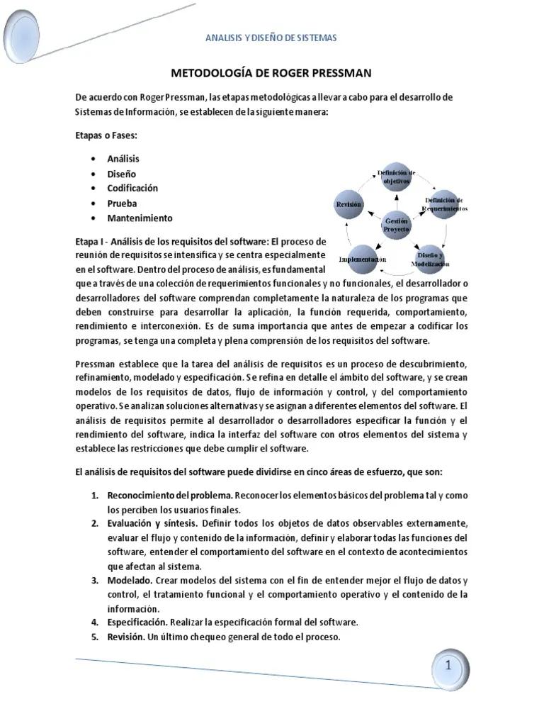 Pressman presenta una metodología que abarca las diferentes etapas del ciclo de vida del software, enfatizando la importancia de un enfoque sistemático y disciplinado. Si bien existen varias metodologías de desarrollo, la influencia de Pressman se refleja en muchas de las prácticas actuales. Algunas de las claves de su metodología son:
