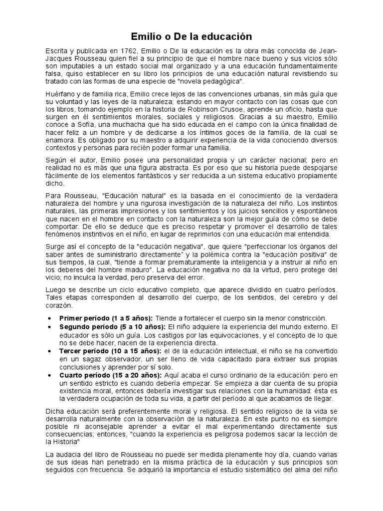 La obra se centra en la educación de Emilio, un niño ficticio que Rousseau sigue desde su infancia hasta la edad adulta. El objetivo principal es formar un hombre virtuoso, capaz de desenvolverse en el entorno con autonomía, moralidad y felicidad. A diferencia de las prácticas educativas tradicionales de la época, Rousseau rechaza la educación basada en la memorización, la disciplina rígida y la sumisión a la autoridad. Su método se basa en el desarrollo natural de las capacidades del niño, respetando sus etapas de desarrollo y sus intereses.