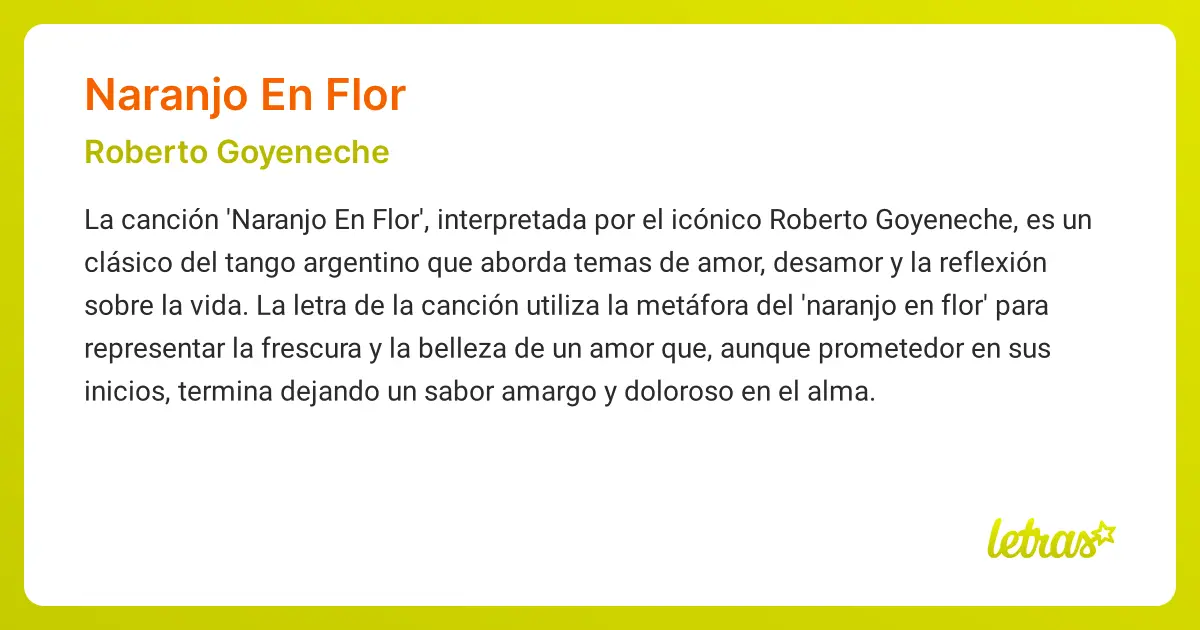 La metáfora del naranjo en flor representa la belleza efímera del amor, su frescura inicial que contrasta con el dolor de la pérdida. La imagen de la "vieja arboleda" y el "pájaro sin luz" evocan la melancolía del recuerdo y la sensación de desorientación tras una experiencia amorosa fallida. El tango no solo explora el amor, sino también la aceptación de la fugacidad y la resignación ante el paso del tiempo. La letra nos presenta una profunda reflexión sobre la vida, la pérdida y la aceptación del pasado.