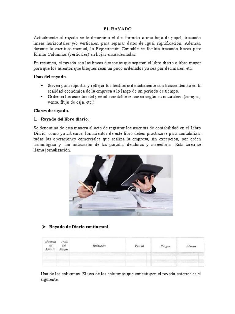 El libro diario es el libro principal de contabilidad donde se registran todas las transacciones de forma cronológica. El rayado del libro diario suele incluir las siguientes columnas: