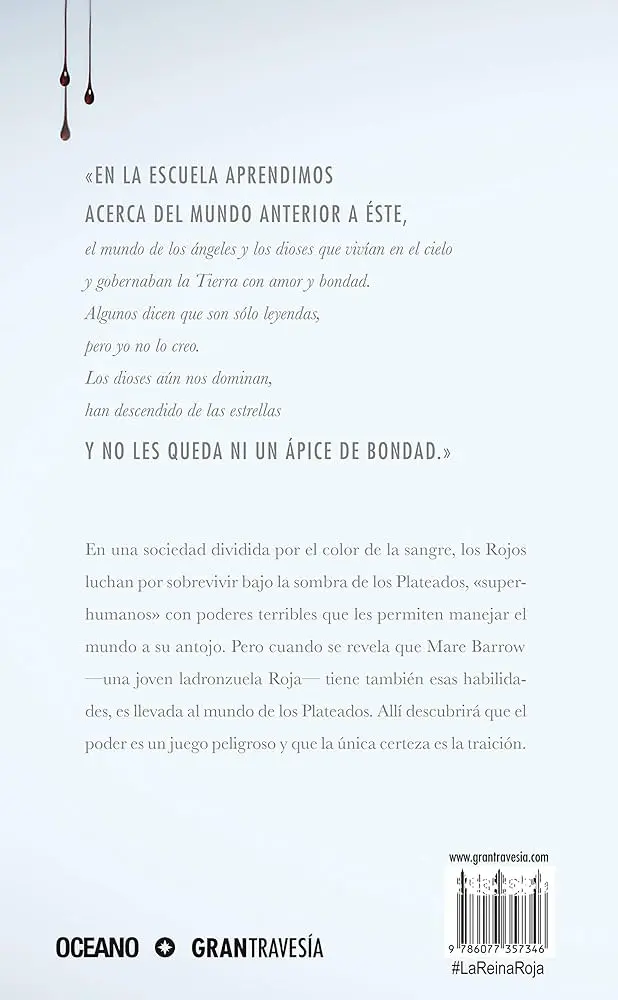 En el primer libro, Reina Roja, conocemos a Mare Barrow, una joven roja que vive en la pobreza extrema en un entorno donde los plateados, con sus poderes sobrehumanos, dominan a la población. El descubrimiento de sus propios poderes eléctricos la catapulta a un entorno de intrigas, traiciones y peligros. Forzada a hacerse pasar por una princesa plateada, Mare se ve envuelta en un juego político mortal, mientras conspira en secreto con la milicia roja para derrocar al régimen opresor. Este primer volumen sienta las bases de la saga, presentando un entorno complejo con una sociedad profundamente desigual.