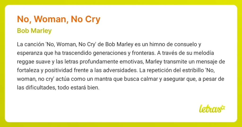 | ¿Cuál es el significado de No Woman No Cry ? | Es un mensaje de consuelo, esperanza y resiliencia ante la adversidad. |