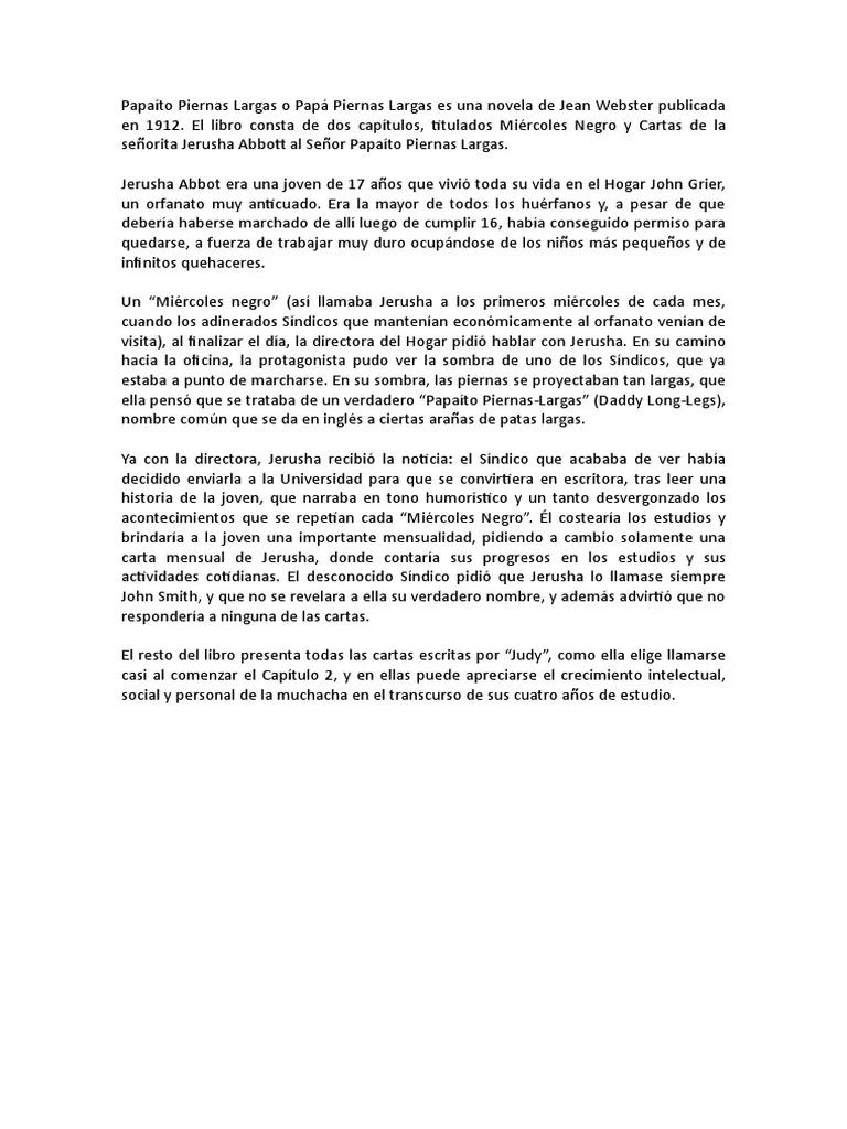 - ¿De qué trata Papá Piernas Largas? La novela relata la historia de Judy Abbott, una huérfana que recibe la oportunidad de estudiar gracias a un misterioso benefactor.