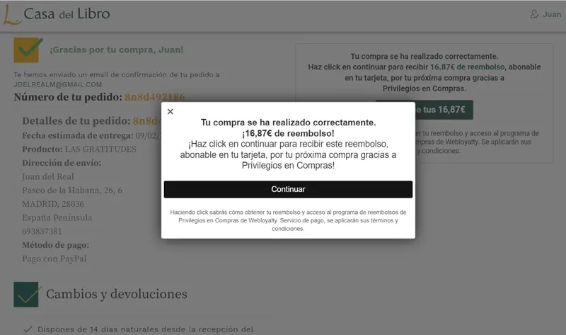 - Tras finalizar tu compra, se mostrará un mensaje de confirmación. Pulsa "continuar" para iniciar el proceso de suscripción.