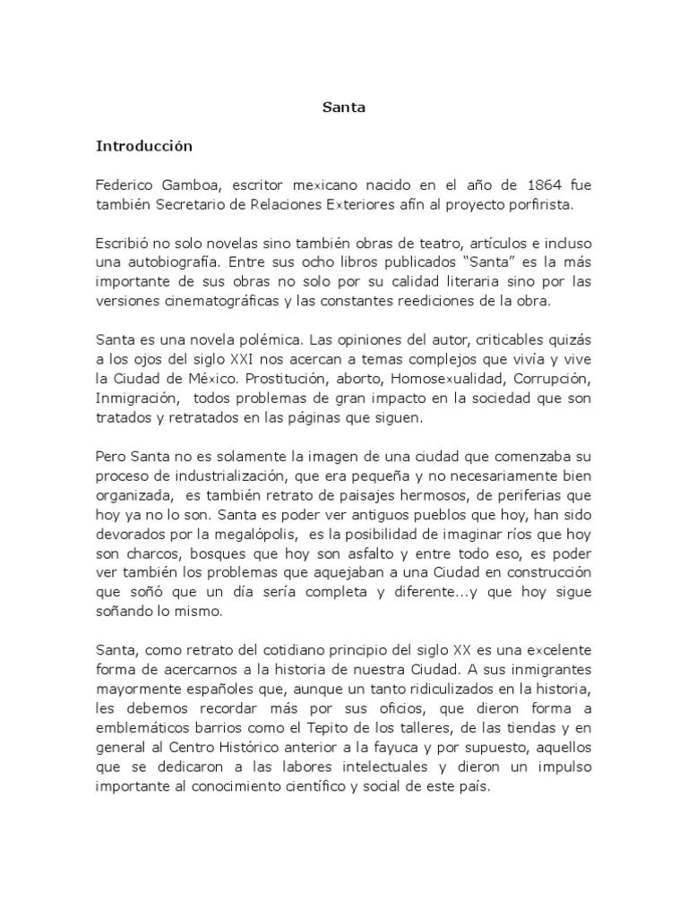 | ¿Cuál es el tema principal de Santa ? | El tema principal es la vida de una joven que se ve obligada a la prostitución por las circunstancias y la hipocresía social. |