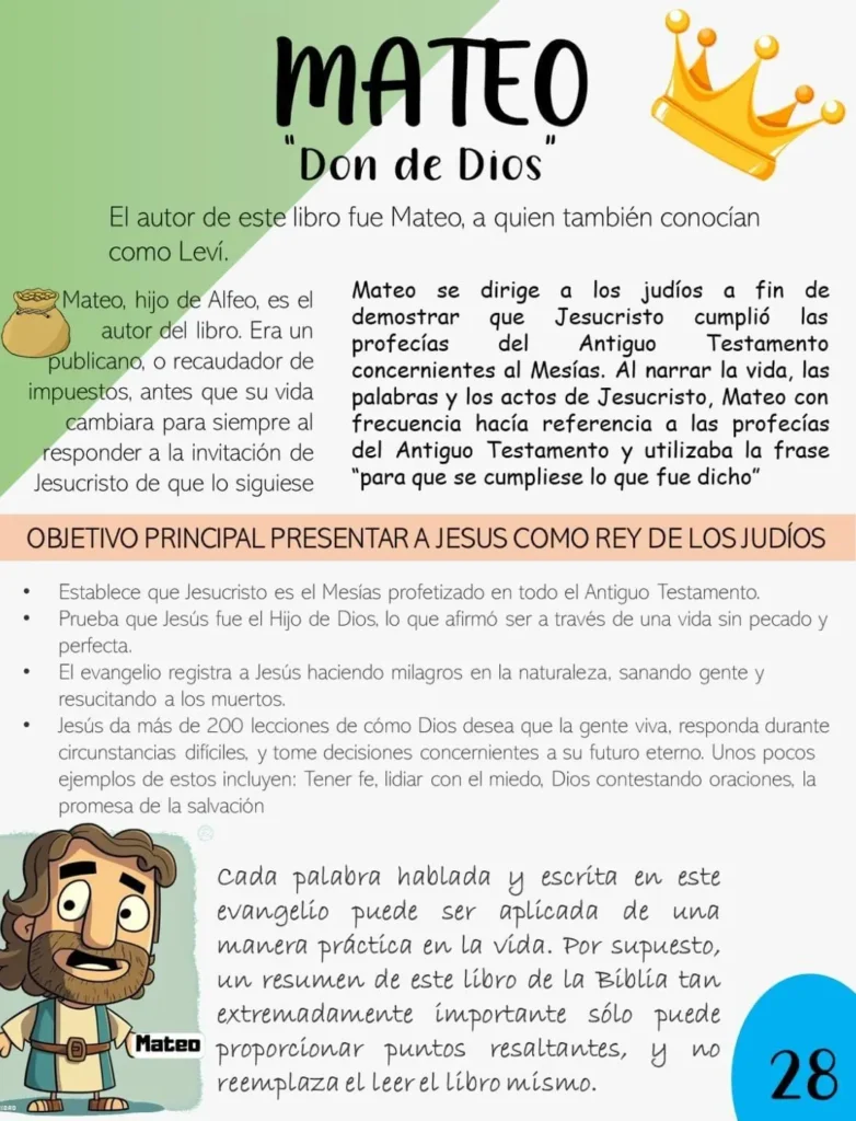 El Evangelio según Mateo es el primero de los cuatro Evangelios canónicos y se caracteriza por su enfoque en presentar a Jesús como el Mesías prometido en el Antiguo Testamento, el Rey de los judíos, cumpliendo así las profecías mesiánicas.