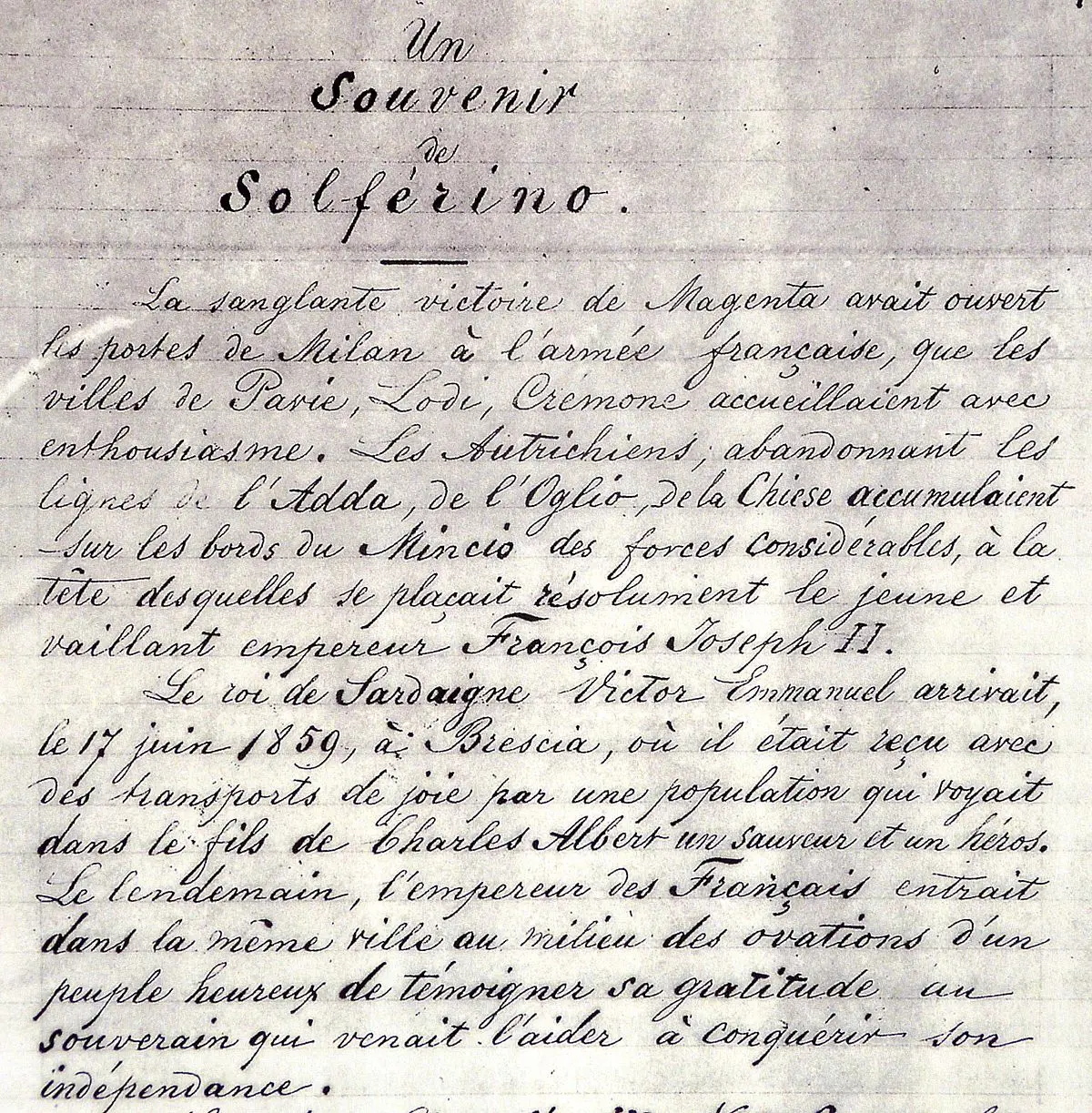 Recuerdo de Solferino ( Un Souvenir de Solférino), escrito por el filántropo suizo Henry Dunant y publicado en 1862, es un libro de memorias que relata la experiencia del autor tras presenciar la batalla de Solferino en 185Este evento bélico, en el contexto de la unificación italiana, dejó un campo de batalla con cerca de 3000 soldados heridos, agonizantes o muertos, una imagen que marcaría para siempre a Dunant.